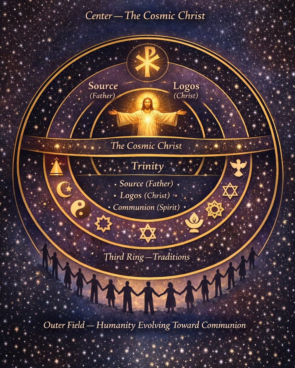 This map is not merely a diagram. It is a contemplative navigation system — a way of seeing how the deepest wisdom of humanity converges in a living center.
